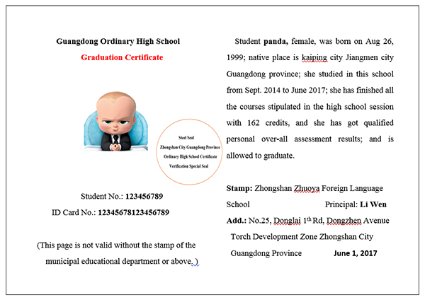 天津市高中畢業證樣本